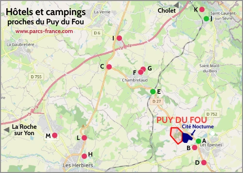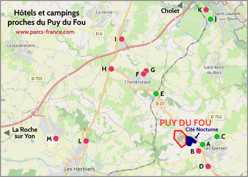 carte hotels près du Puy du Fou 2025Localisez sur la carte les hôtels en rouge et campings en vert :