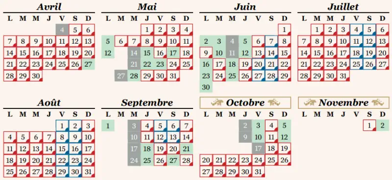 En 2026, cela concerne le vendredi 3 avril (veille du lancement de la saison), le mardi 12 mai, les mercredis 20 et 27 mai, les mercredis 3 et 10 juin, les mercredis 9, 16 et 23 septembre, le vendredi 2 octobre, les jeudis 8 et 15 octobre, le vendredi 18 décembre (veille des vacances de Noël).