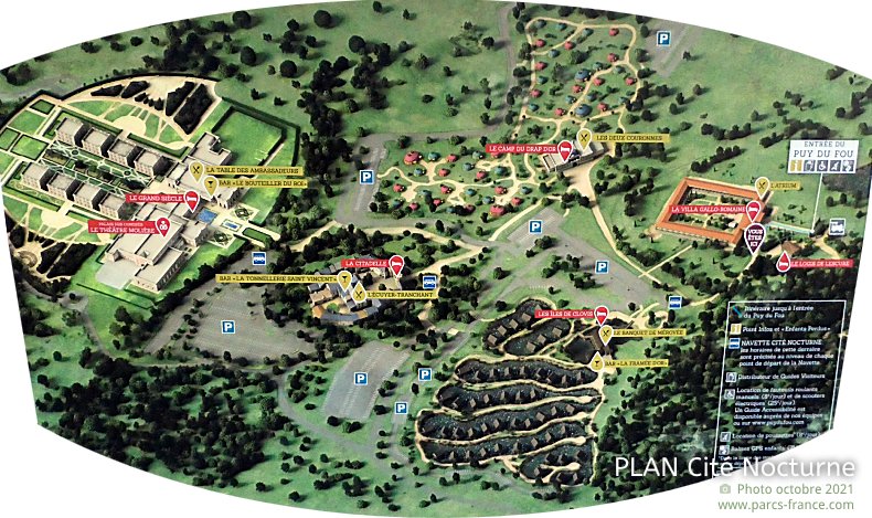 Le plan affiché sur de grands panneaux vous permet de vous repérer au sein de la Cité. Il nous donne une vue d’ensemble avec les hôtels (marqueurs rouges), restaurants et bars (marqueurs jaunes) et les différentes parkings. De gauche à droite, situez les 6 hôtels : Le Grand Siècle, La Citadelle, Le Camp du Drap d’Or, Les Îles de Clovis, La Villa Gallo-Romaine, Le Logis de Lescure. L’entrée directe vers le parc du Puy du Fou est indiquée dans le rectangle blanc à droite du plan.