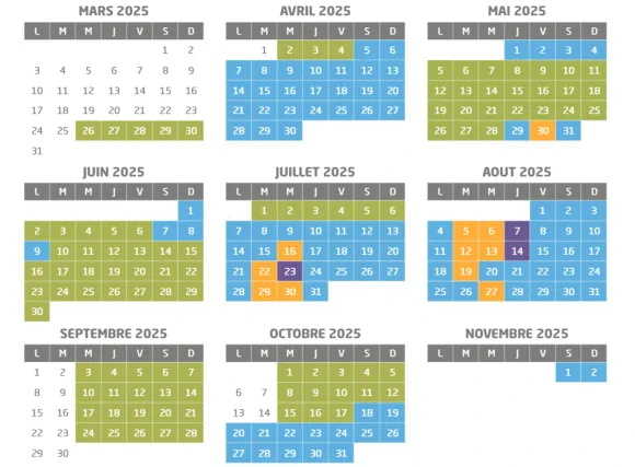 Période Bleue = en avril (du 5 au 30), en mai (du 1er au 4, 29 et 31), en juin (1er et du 7 au 9), en juillet (du 7 au 15, du 17 au 21, du 24 au 28 et 31), en août (du 1er au 4, du 8 au 11, du 15 au 18, du 20 au 26 et du 28 au 31), en octobre (du 18 au 31), en novembre (1er et 2)