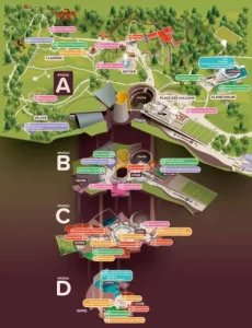 Consultez ici le plan de Vulcania sur 4 niveaux (A, B, C et D) pour situer facilement toutes les animations, attractions, spectacles, les points de restauration et les boutiques.