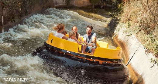 à partir de 0,90 m accompagné d’un adulte : Coccinelle, Aquachutes, Tapis Magique, Tea Cup, Radja River, Splash Battle, Drakkar